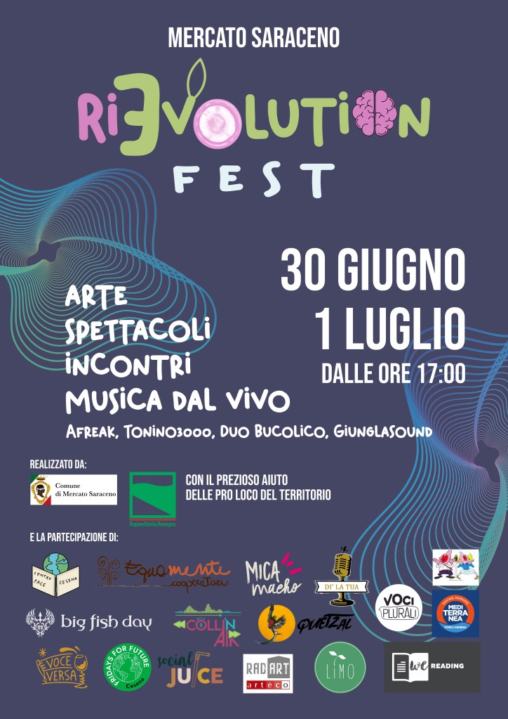 Venerdì 30 giugno e sabato 1 luglio ci sarà la prima edizione del RiEvolution Fest, un festival con una ricca programmazione, realizzato dal Comune di Mercato Saraceno e dalla Regione Emilia-Romagna, con la colalborazione delle Pro Loco, e la partecipazione di tantissime realtà del territorio: Cooperativa Equamente, Voci Plurali, Limo APS, Fridays for Future Cesena, Mediterranea Saving Humans Forlì-Cesena, Mica Macho, WeReading, VoceVersa, Centro Pace Cesena, RadArt Arteco, Social Juice, Big Fish, Circol Quetzal.